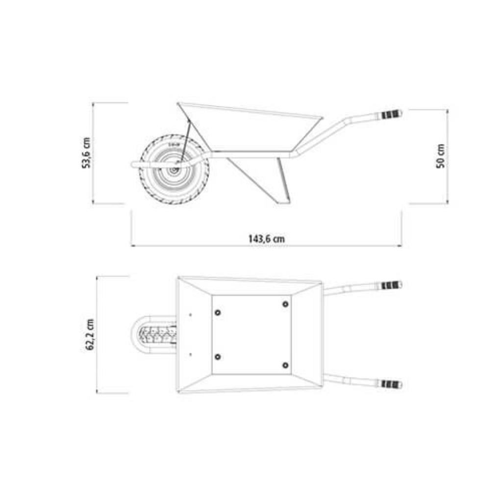 - Conjunto carrinho-de-mão com estrutura de cantoneira e caçamba metálica quadrada reforçada com capacidade para 70 litros.