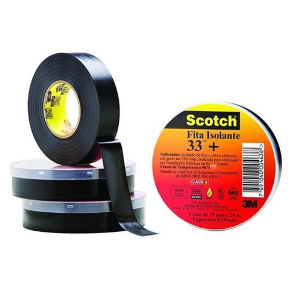 Fita isolante 33+ ,É um produto a base de PVC anti-chamas, tem alta resistência à tensão (até 750V), de cor preta e extrema conformabilidade às mais variadas superfícies, utilizada na construção civil para isolamentos e proteções elétricas em residências,eletrodomésticos etc, além de reparos em geral.